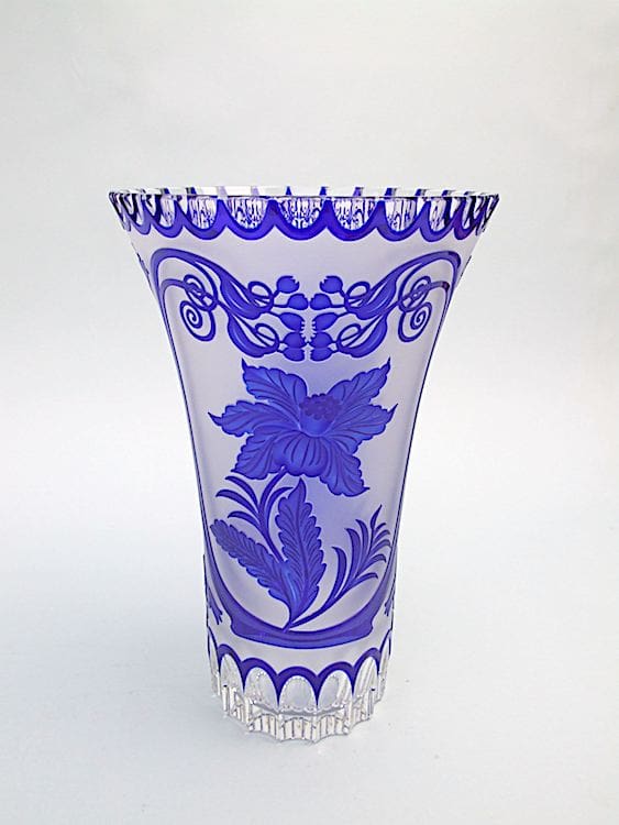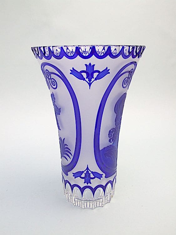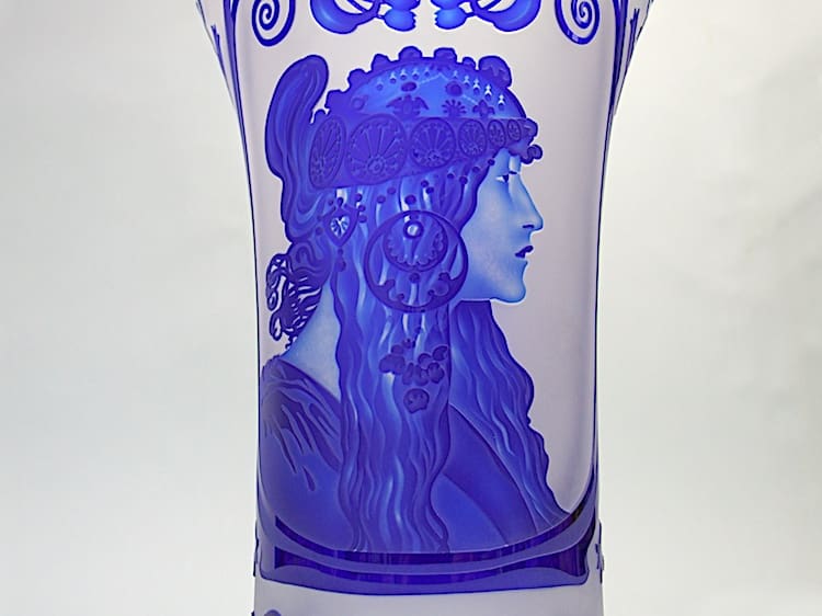 Cobalt blue vase with etched and enamelled Alphonse Mucha design – The Blonde. I am not sure when if was made but probably 1980’s as the underside is marked FS Czech republic.