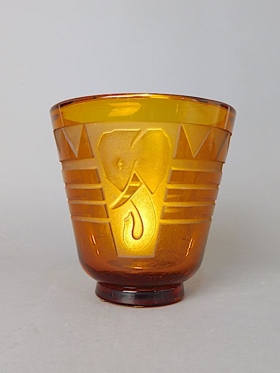 French art deco cubist amber glass elephant vase. Signed to the base Muller Freres.