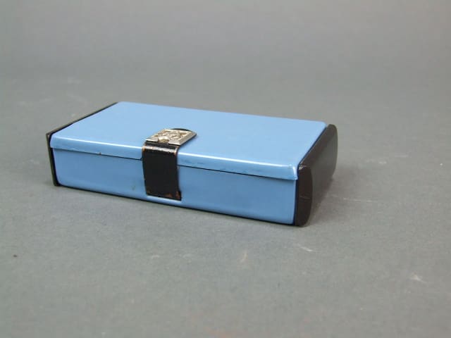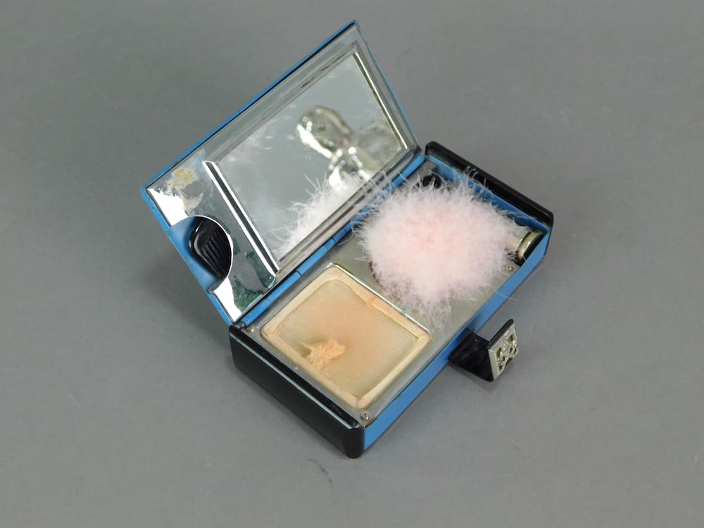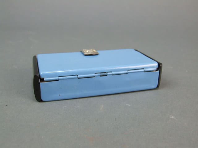 Blue enamel case with black celluloid ends, one of which is a pull out drawer. Lever arm lid release and inside there is a mirror with a small black comb hidden behind it (one tooth missing). Also a section for powder with a mesh and fluffy pink puff and a lipstick holder.