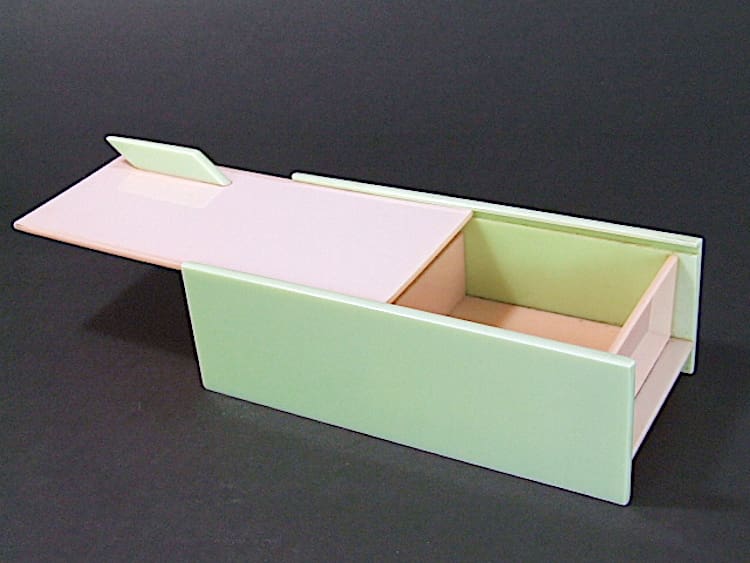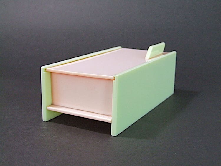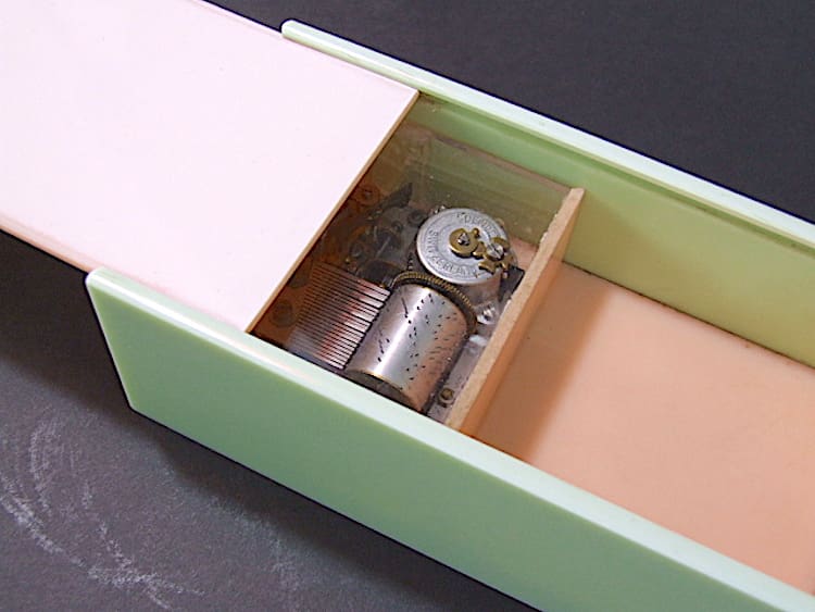 Phenolic pale green and pink jewellery box. Lid slides sideways to reveal a jewellery section and the mechanical mini pianola movement – which is marked Cuendet Switzerland. I am not sure what the tune is that it plays but the it is still working.