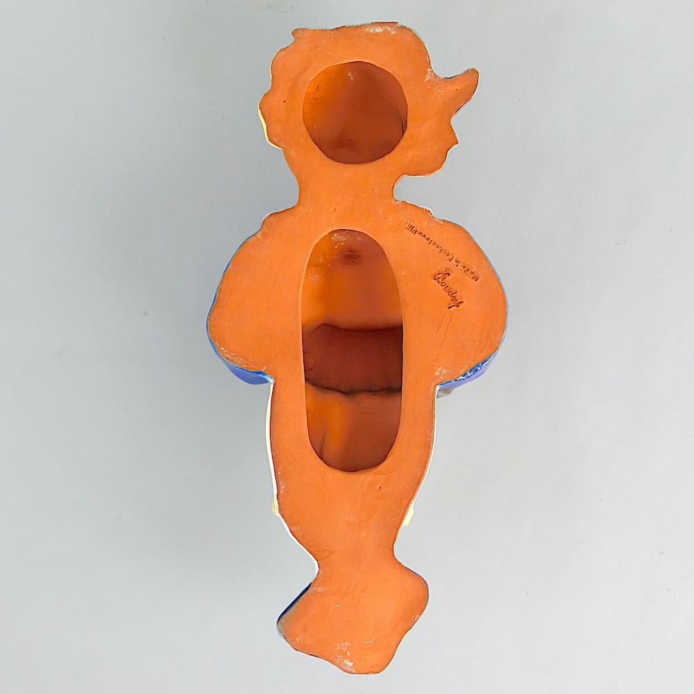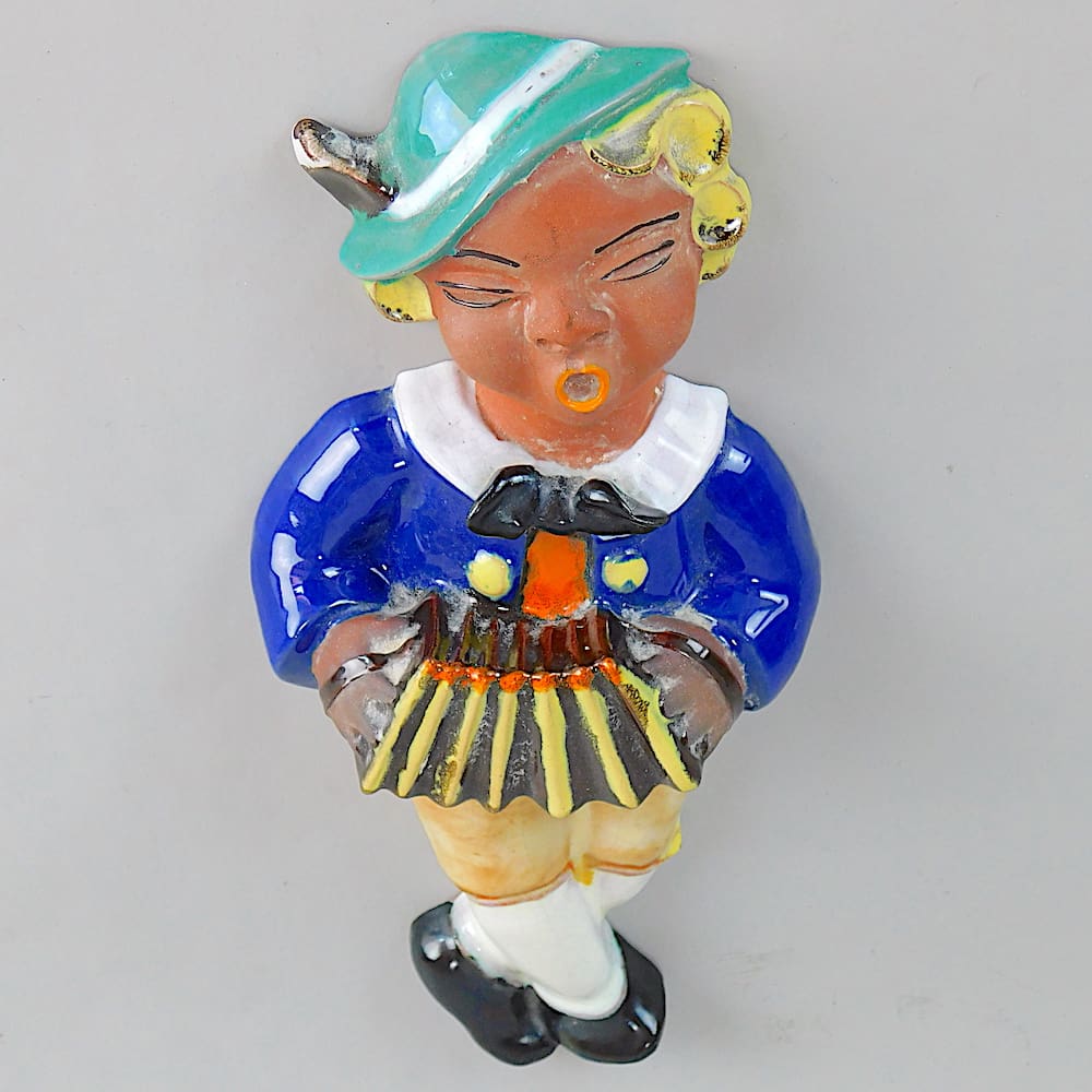 Czech hand painted Art Deco terracotta boy playing a harmonioum, wall plaque.