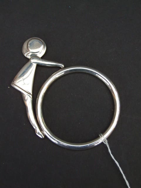 Silver napkin ring of a girl with a hoop.