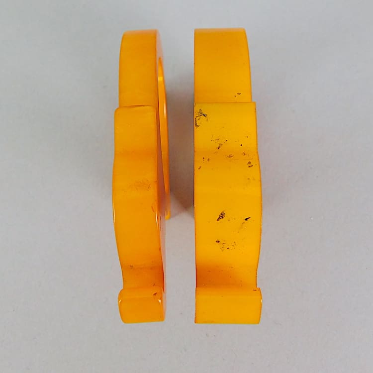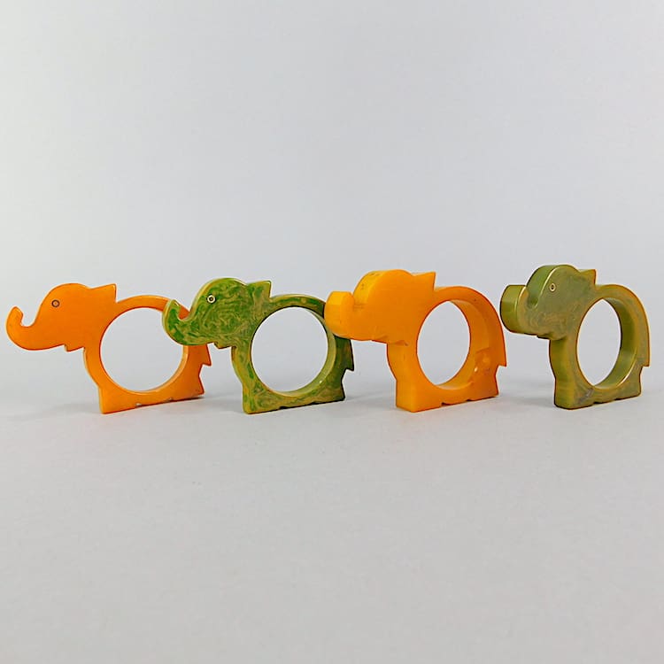A set of four art deco phenolic or possibly bakelite napkin ring holders, although one is thicker than the rest so may be a from a different set.