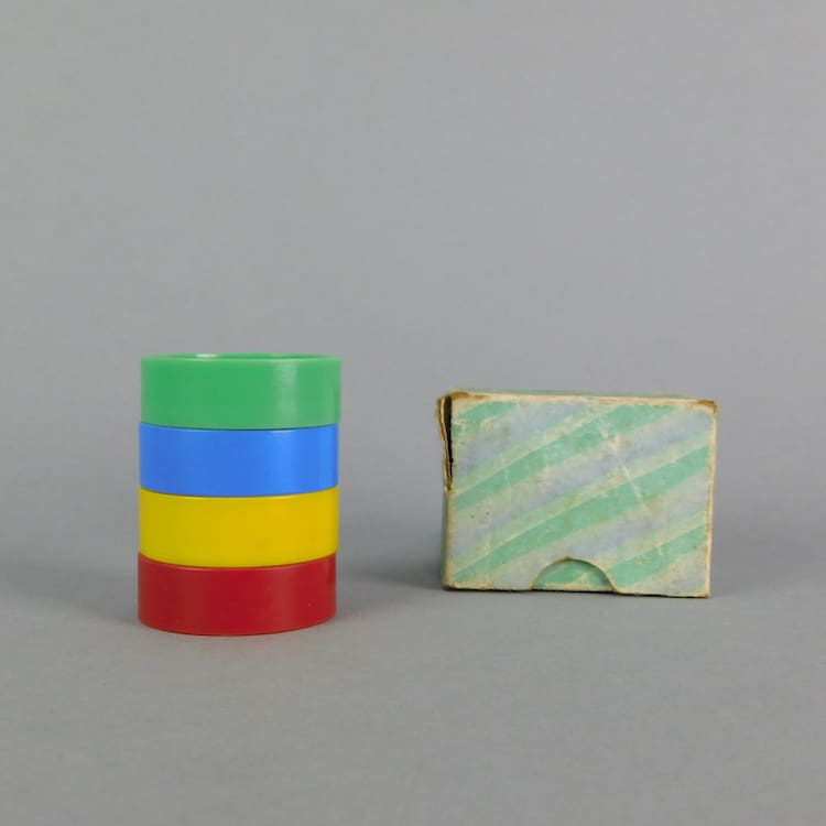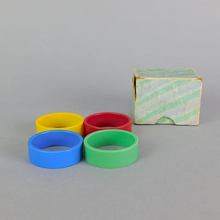 Set of four coloured phenolic napkin rings in their original box and unused.
