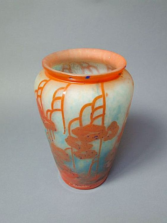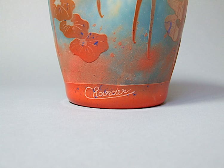 I believe this vase is a contemporary piece, although signed Charder. It is made of Pate de Verre glass in blue, cream and orange nasturtium pattern.