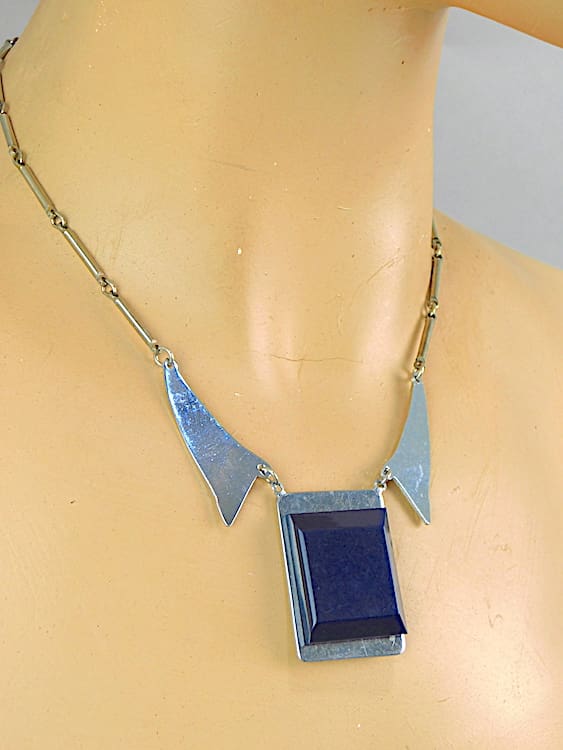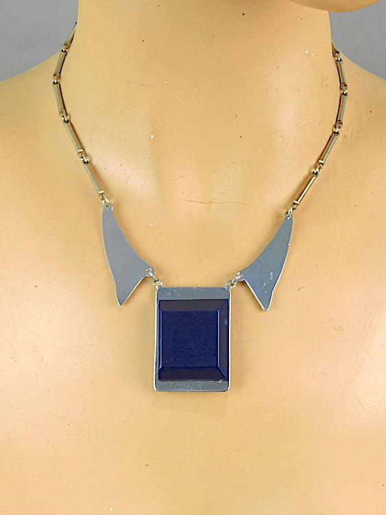Stylish chrome square and wings with central square canted edge galalith plate in navy blue. Made in the 1930’s by Jakob Bengel.