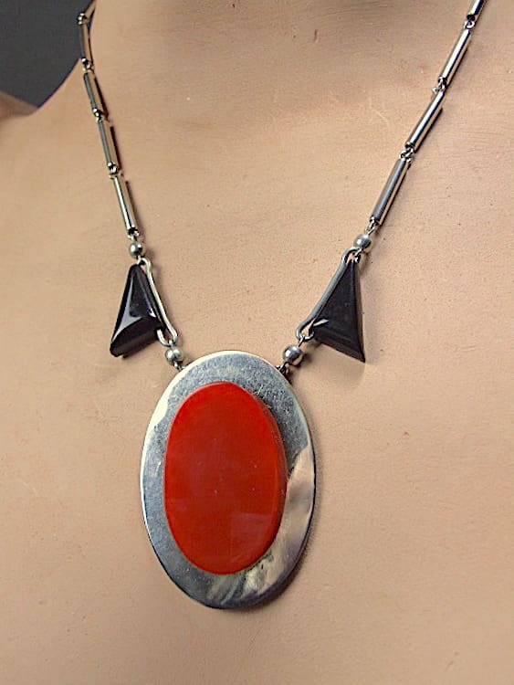 Red and black galalith and chrome necklace by Jakob Bengel, made in the early 1930s.