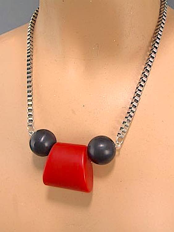Red and black galalith necklace on box chain by Jacob Bengel.