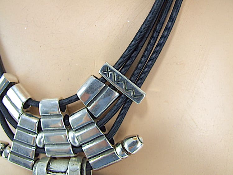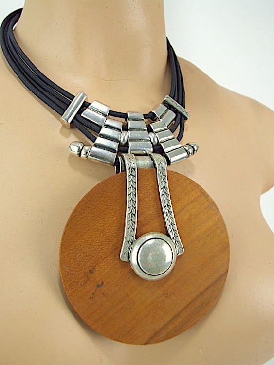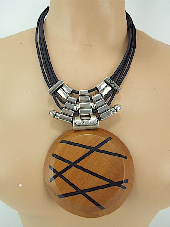 A Max Debraine vintage limited edition necklace. This chunky necklace is made of wood with silver detail. A signed Max Debraine and the necklace can be worn either way as there is another pattern to the rear. It is strung on a black silk cord.