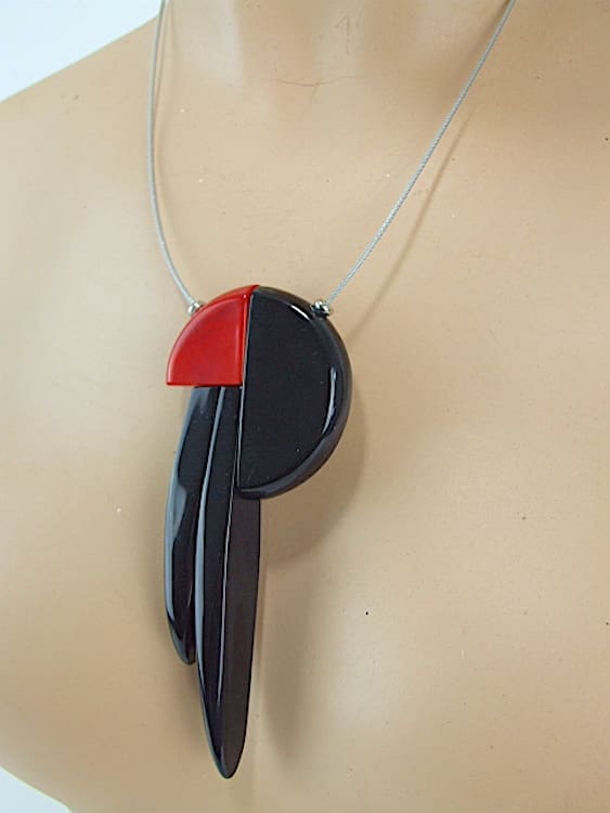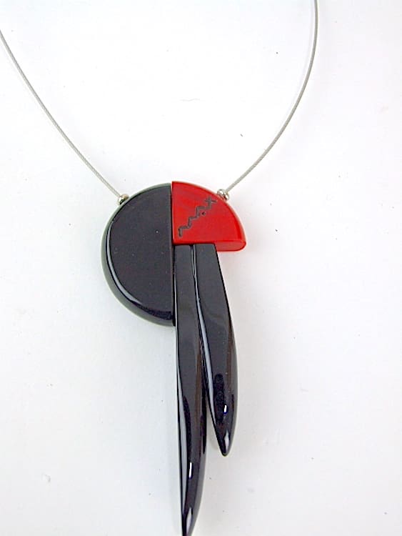 A vintage modernist limited edition necklace. Made of black and red galalith mounted on spun wire. It fastens with a magnet on the red panel which is signed to the back.