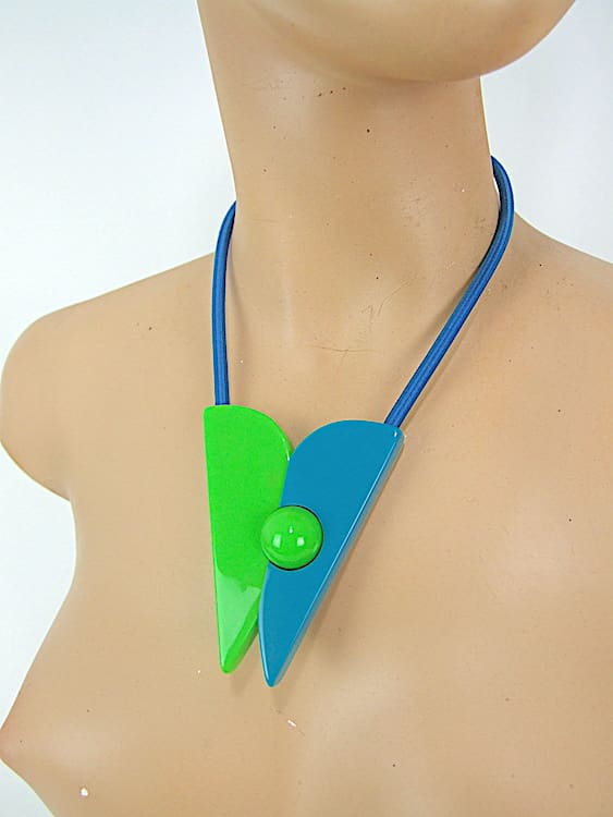 French Art Deco style designer modernist phenolic resin necklace by Max Debraine. Max Debraine – architect and designer specialising in jewellery items. This is an unsigned vintage Debraine and no longer in production. Blue and green resin with a central ball magnet to fasten it.