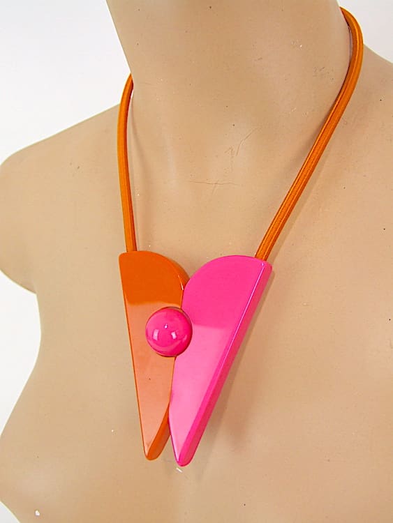 French Art Deco style designer modernist phenolic resin necklace by Max Debraine. This is an unsigned vintage Debraine and no longer in production. Pink and Orange resin with a central ball magnet to fasten it.