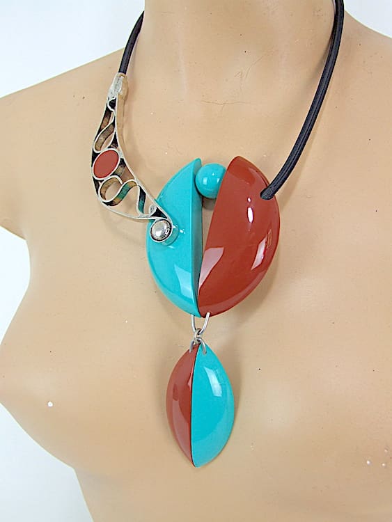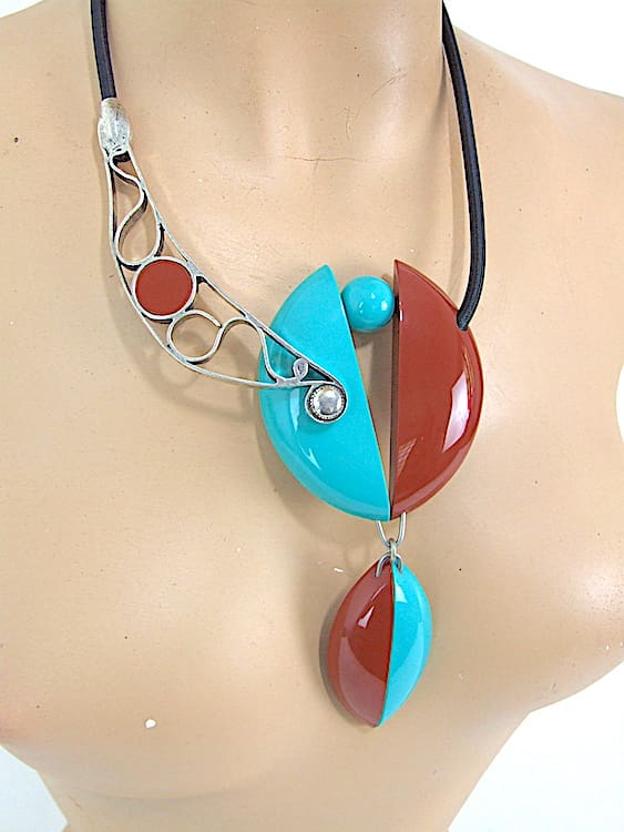 French Art Deco style designer modernist galalith necklace by Max Debraine. This is an unsigned vintage Debraine and no longer in production. Brown and turquoise phenolic resin with cord hanger. Fixes to the front with a magnet on the metal section in true Debraine design.