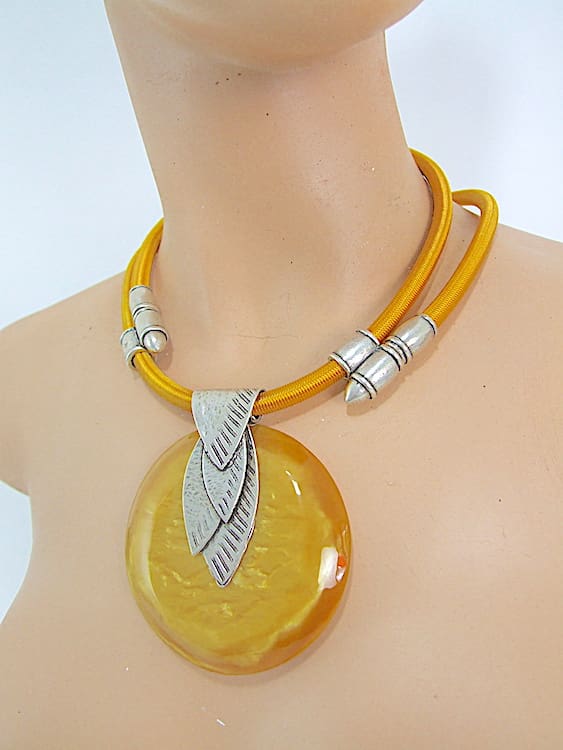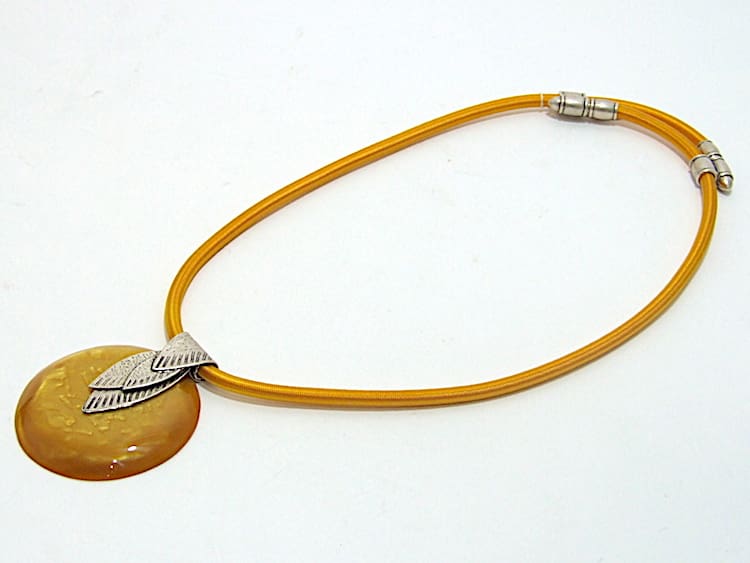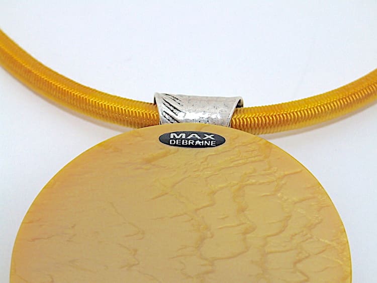 French Art Deco style designer modernist galalith necklace by Max Debraine. Pearlised yellow galalith with yellow adjustable cord hanger. Signed to the reverse and no longer in production. Fixes to the side with a magnet on the metal sections in true Debraine design.