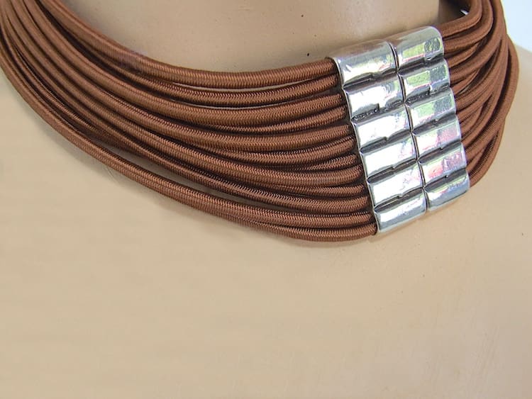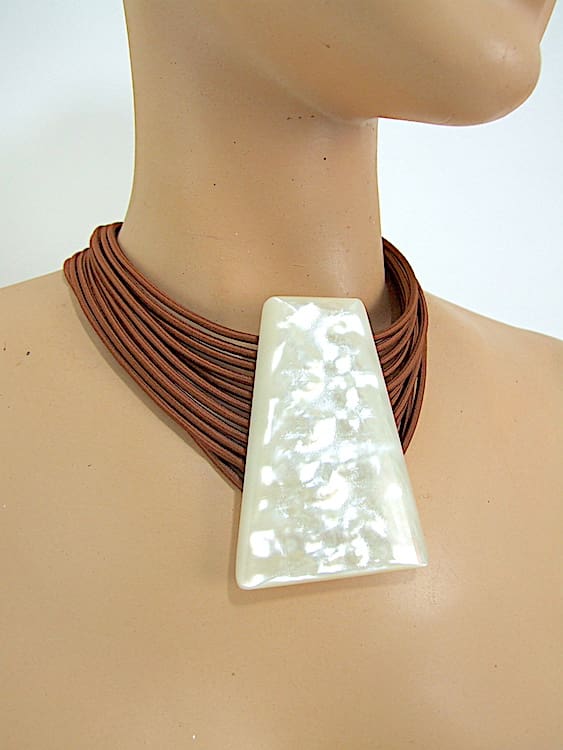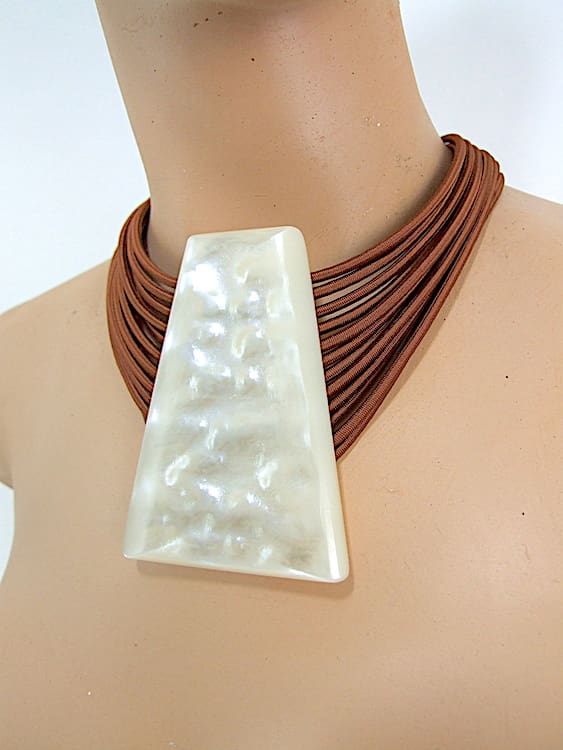 French Art Deco style designer modernist galalith necklace by Max Debraine and is signed to the back. Pearlised phenolic resin with bronze cord hanger. This is a signed vintage Debraine and no longer in production. Fixes to the back with a magnet on the metal section in true Debraine design.