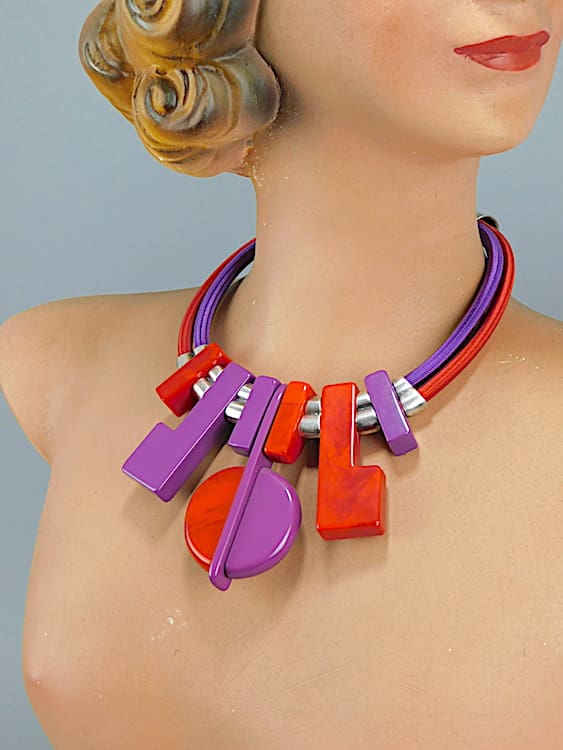 A chunky necklace by Max Debraine, made on commission to a unique art deco design. Hand made out of red and purple galalith and polished metal. Engraved with the Max De Braine brand logo. Suspended upon sleek red and purple silk braided cord with an adjustable silver fastening so can be worn at alternative lengths.