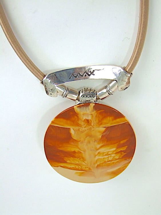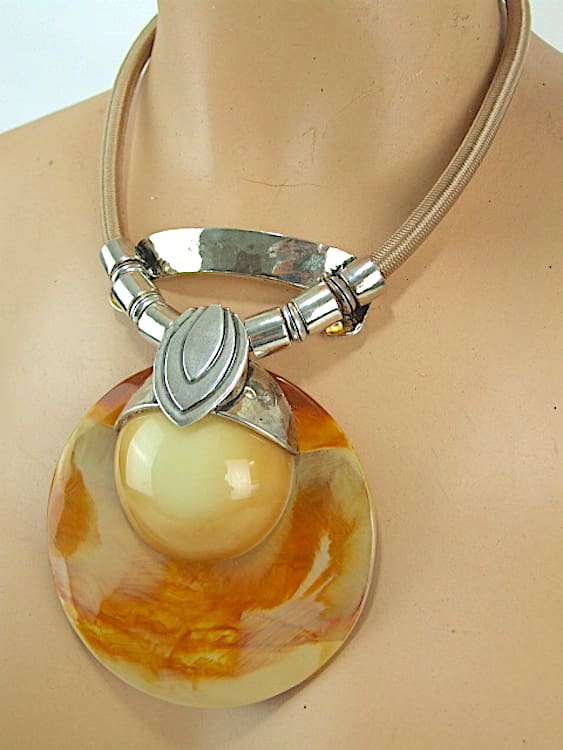 A large vintage modernist limited edition necklace. This chunky necklace is made of amber swirl galalith with silver metal – signed to the back. It is strung on a gold silk cord.