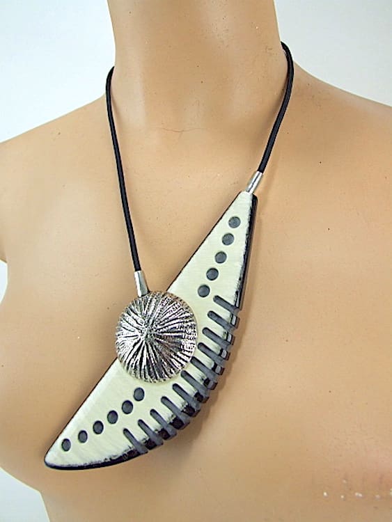 A Max Debraine vintage modernist limited edition necklace. It fastens with a central metal magnet to the disc which is signed to the back. Strung on silk cord.