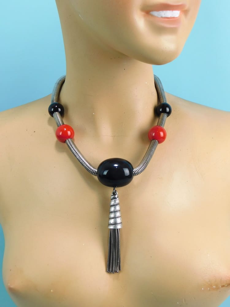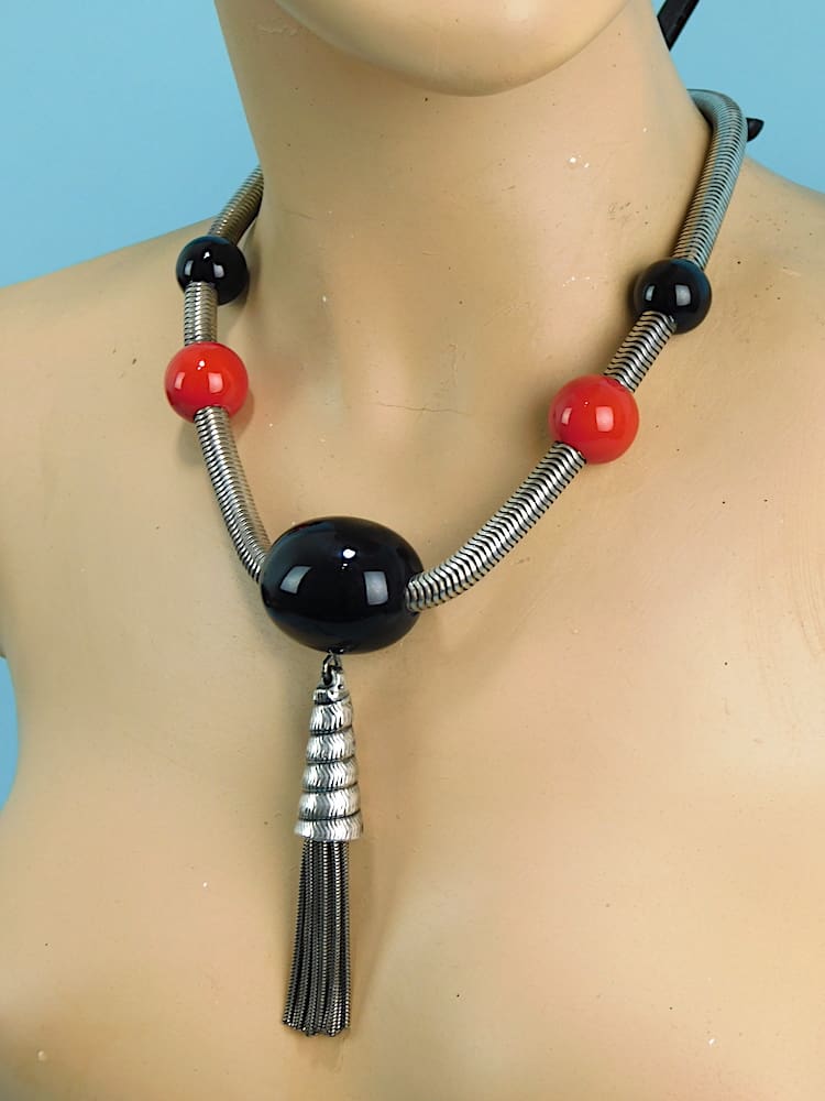 Fabulous French red and black galalith and snake chain tassel necklace. Made in Paris by Guillemette L’Hoir and signed to the reverse. Dates to around the 1970’s. L’Hoir jewellery can be viewed in the Paris Museum of Jewellery. Many of the designs were based on original jewellery of the 1920’s by Auguste Bonaz.