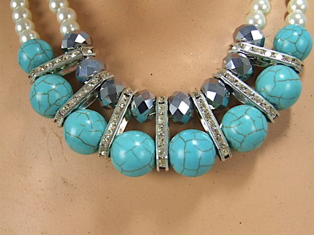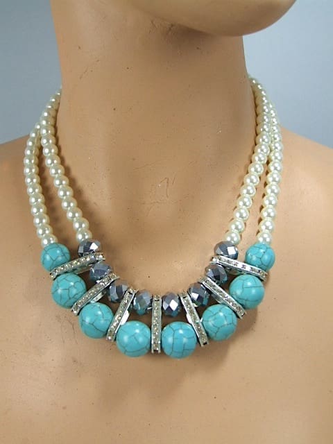 Modern necklace set consisting of earrings, necklace and stretch bracelet, in faux pearl, rhinestone and turquoise bead.