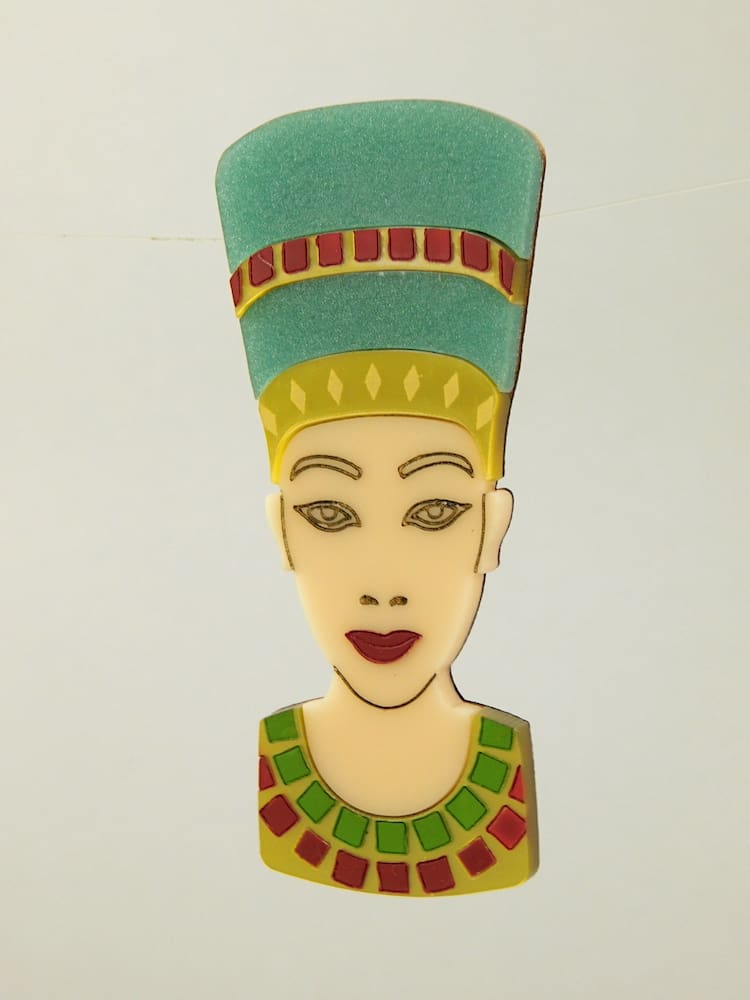 Large phenolic Egyptian Queens head brooch. Fitted with a roll safety clasp.