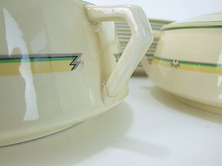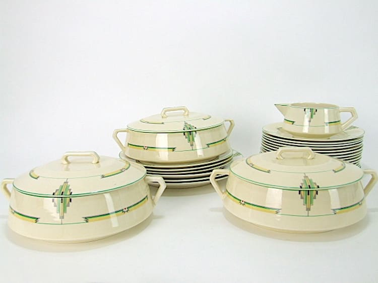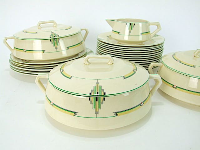 English Nelsonware Metro design art deco motif 1930s dinner service. Consists of 14 smaller plates, 3 medium plates, 3 large dinner plates, 3 Tureens with lids and a gravy boat. Marked BCM/Nelson Ware.
