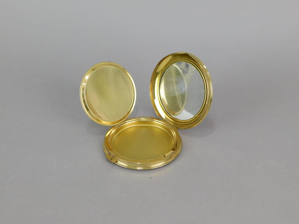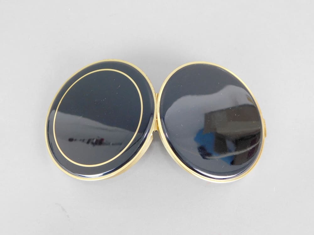 This 1930’s German black enamel and gold striped round compact is old stock from a shop that was never sold, so it is in unused condition and ideal for use. Inside is a mirror to the lid and an internal door with no puff or mesh.