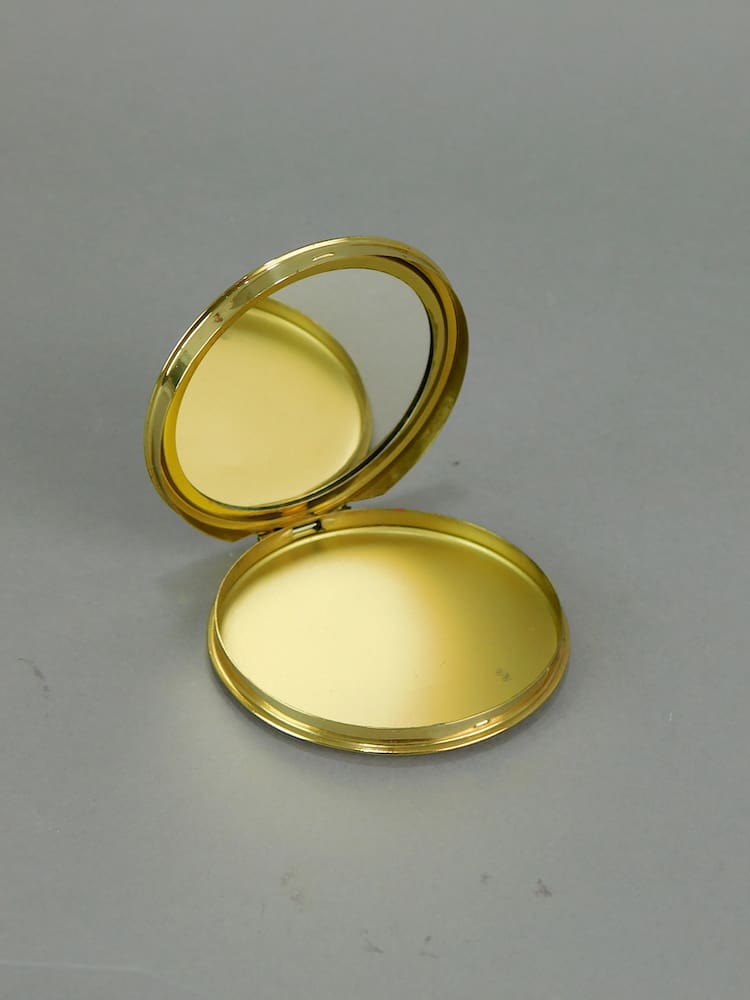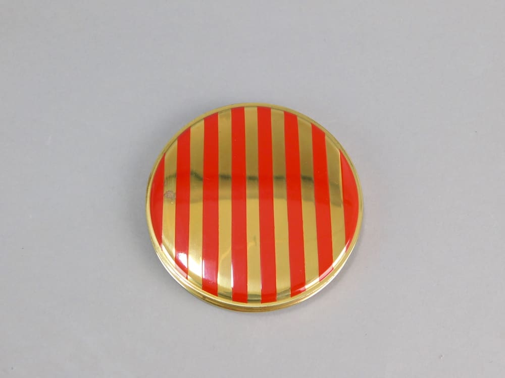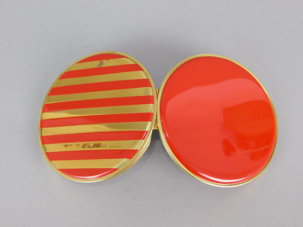 1930’s red enamel compact, old stock from a shop in Germany that was never sold, so it is in unused condition and ideal for use.There is however a small mark to the gold on the lid. Inside is a mirror to the lid with no puff or mesh.