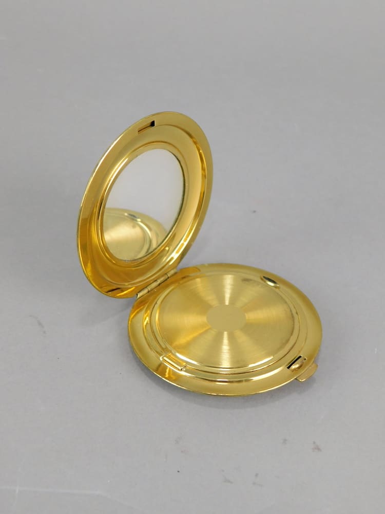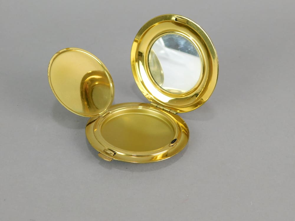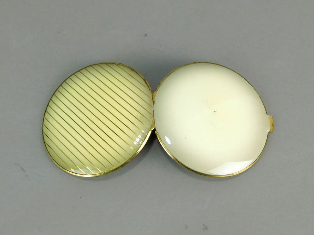 1930’s German cream enamel compact is old stock from a shop that was never sold, so it is in unused condition and ideal for use. Inside is a mirror to the lid and an internal door with no puff or mesh.