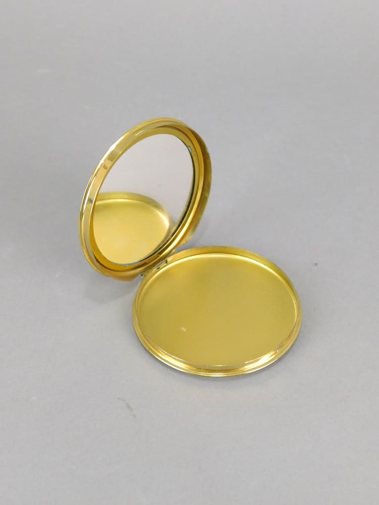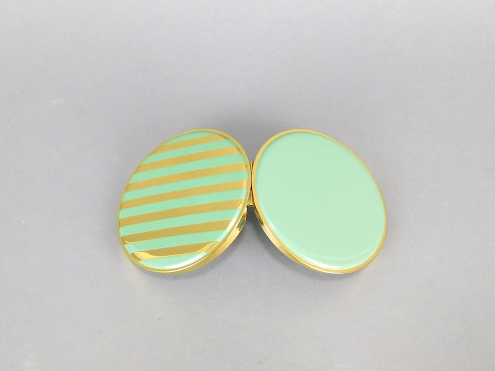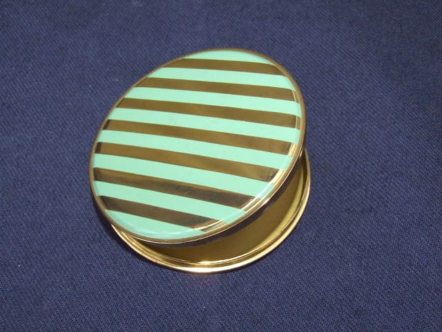 This 1930’s German green enamel and gold striped round compact is old stock from a shop in Germany that was never sold. Inside is a mirror to the lid and an internal door with no puff or mesh.
