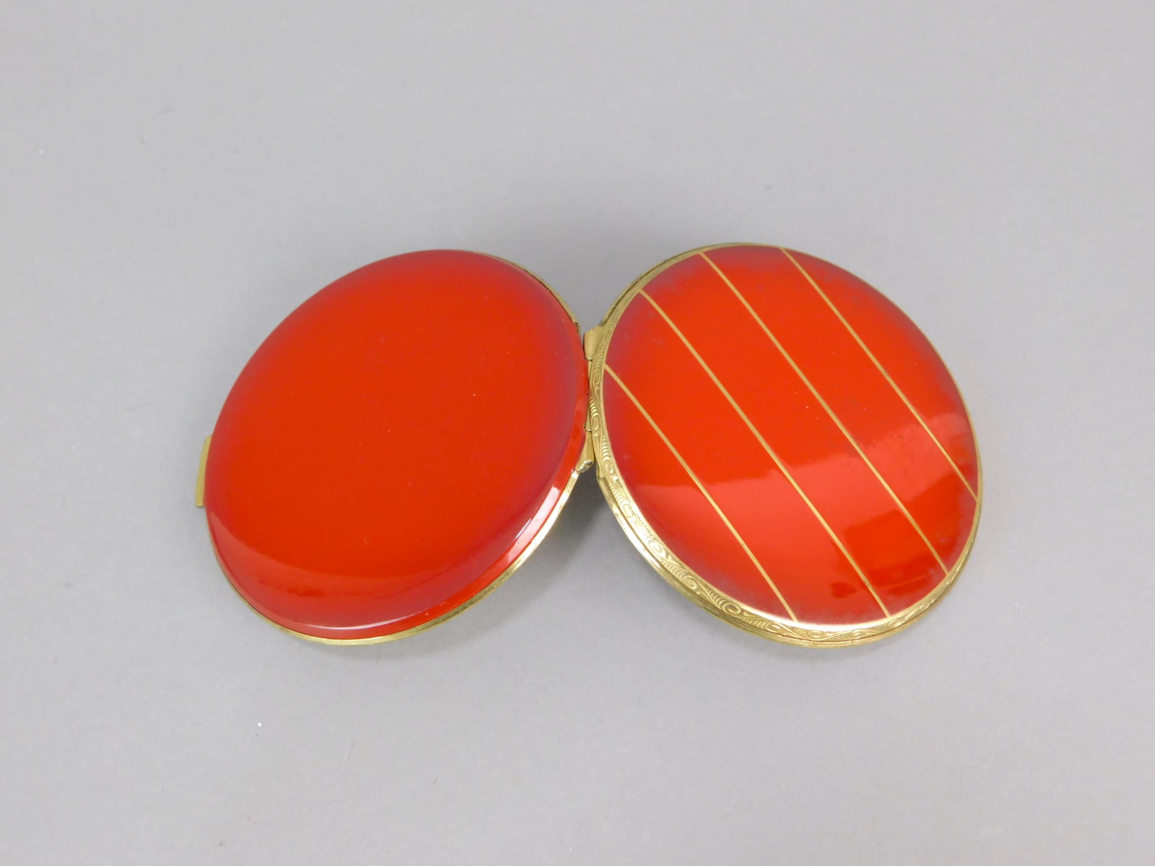 1930’s German red enamel compact, old stock from a shop in Germany that was never sold, so it is in unused condition and ideal for use. Inside is a mirror to the lid and an internal door with no puff or mesh.
