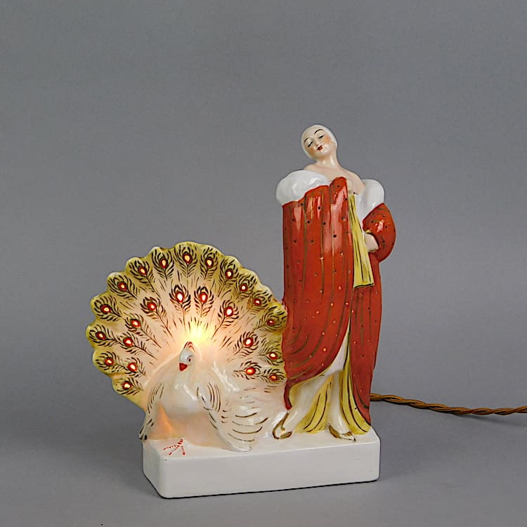 A rare French ceramic nightlight of a lady and peacock, signed Kelety.