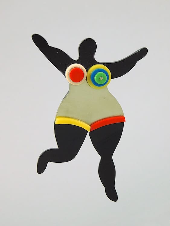 French Art Deco phenolic and metal lady brooch. A Nike de Saint Phalle (1930 – 2002), Nana sculpture (1964–1973) pop art design. Fitted with a roll safety clasp.