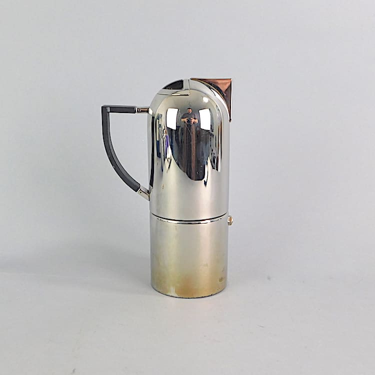 Modernist art deco style stainless steel large coffee pot with black phenolic handles.