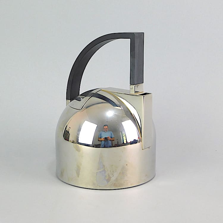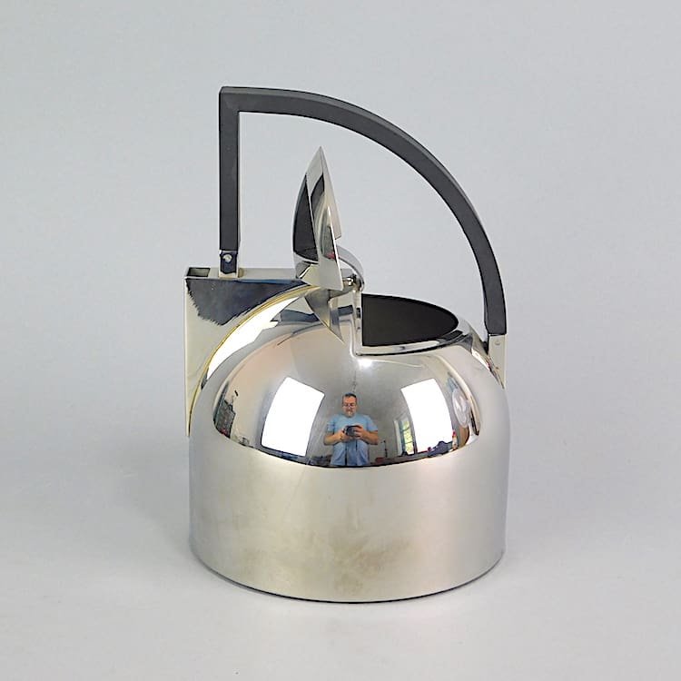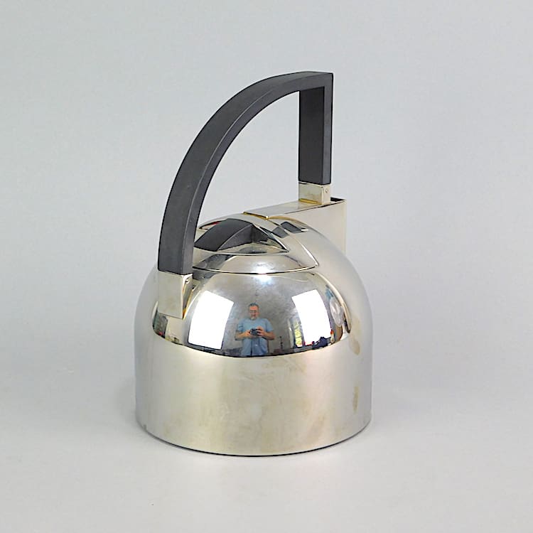 Modernist art deco style stainless steel kettle with black phenolic handle.