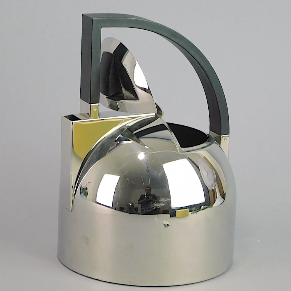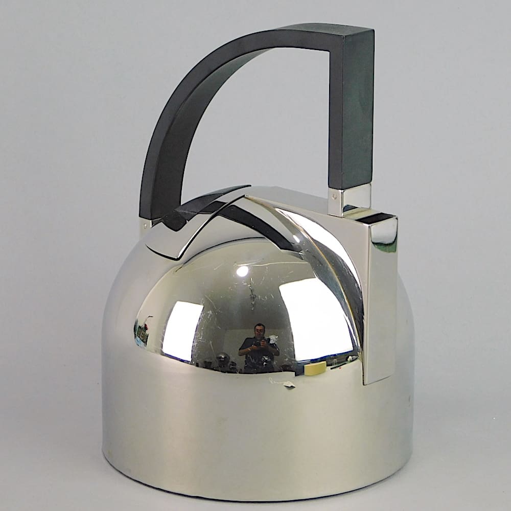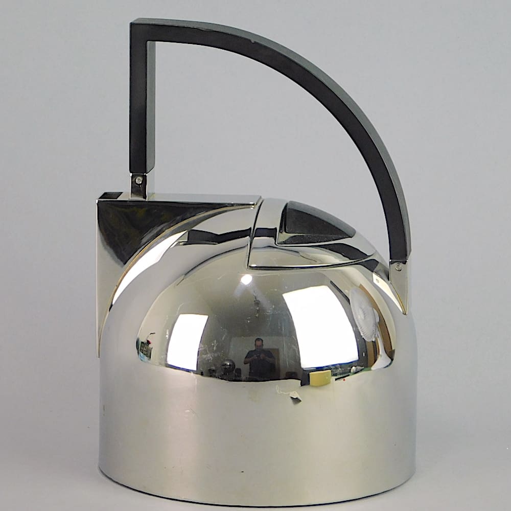 Modernist art deco style stainless steel kettle with black phenolic handle.