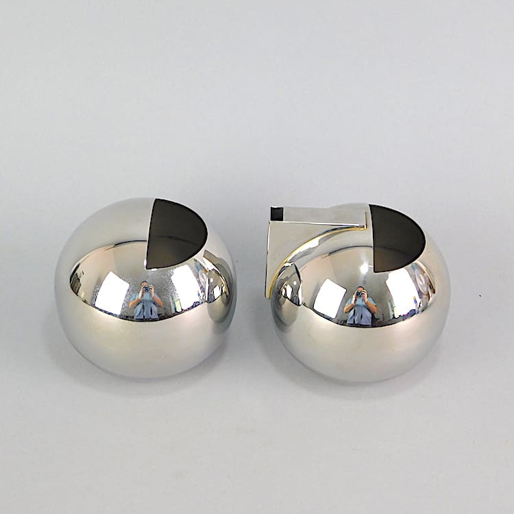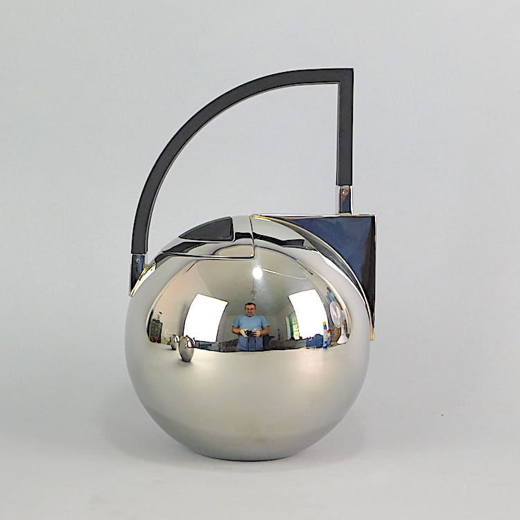 Modernist art deco style stainless steel 4 piece tea set. This is the larger teapot with black phenolic handle.
