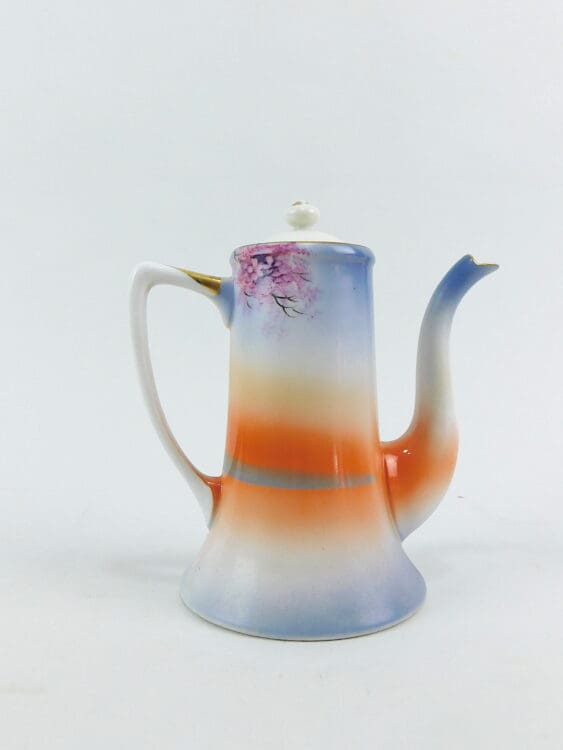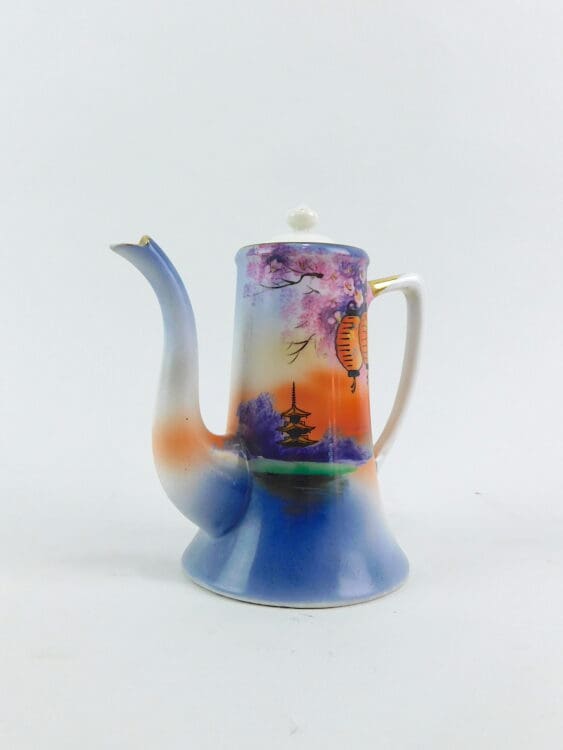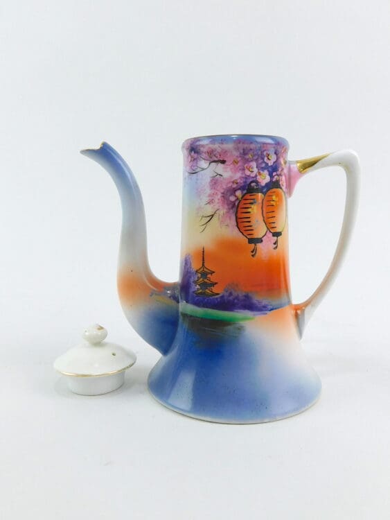 A Noritake art deco Chinese themed coffee pot with a plain white lid.