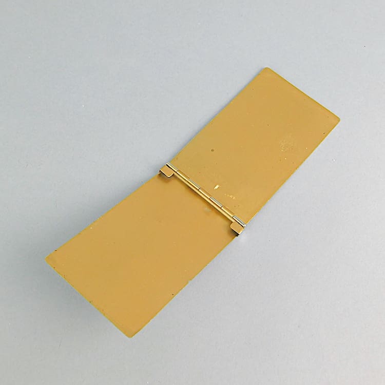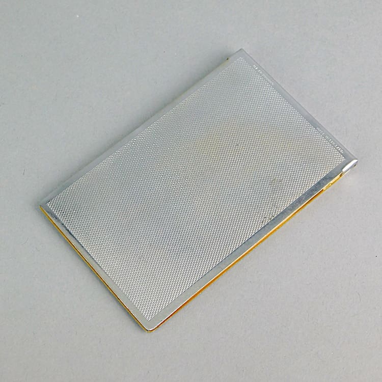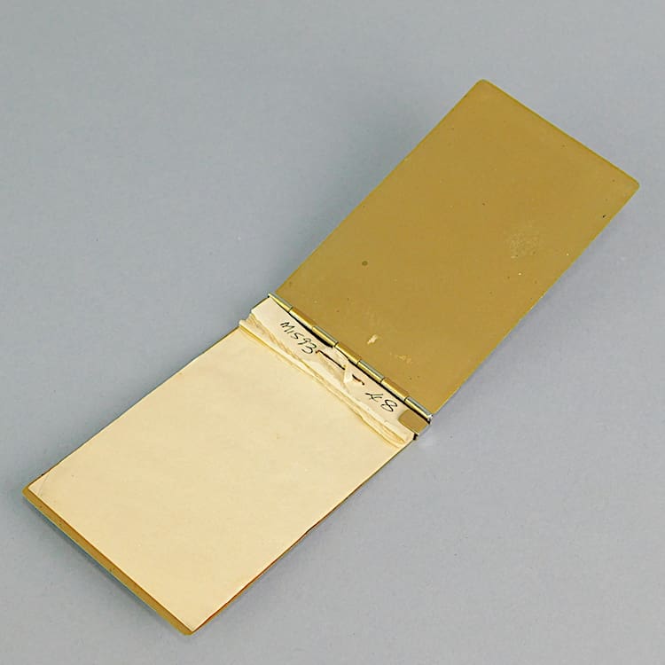 Silvered metal engine turned note book holder. To the cover it says Notes. Inside are a couple of sheets of the old notepad.