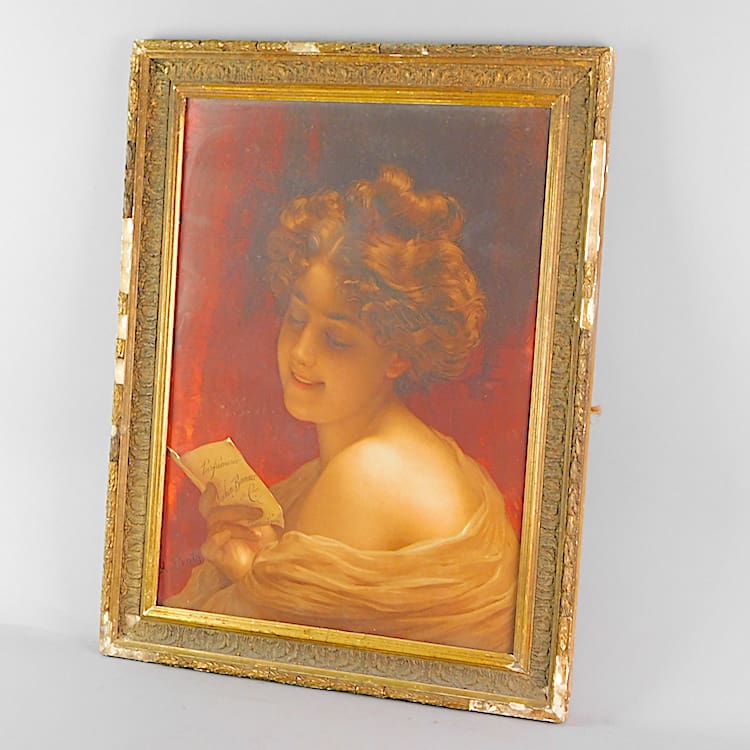 Original French period print of a lady. Frame is original but tatty so could do with a repair or reframing.