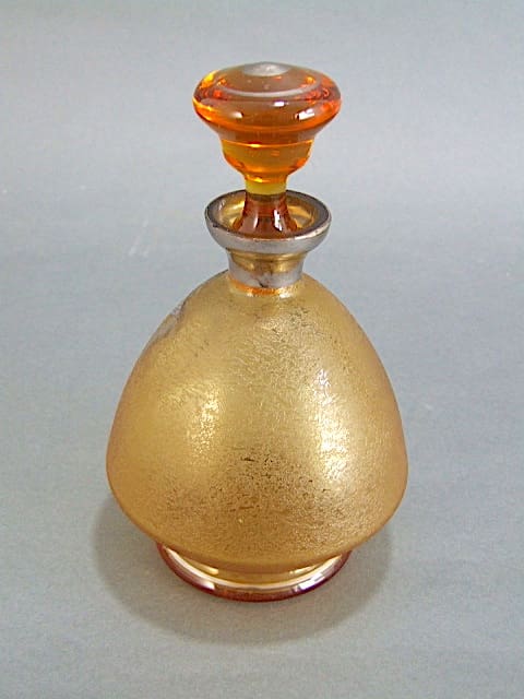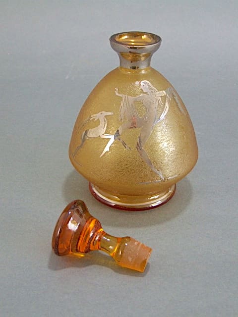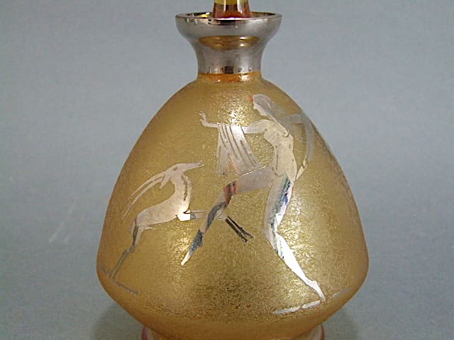 French amber glass art deco decanter featuring a nude female dancer and deer applied in silvered metal. Silvering detail is also present on the stopper, neck and base.