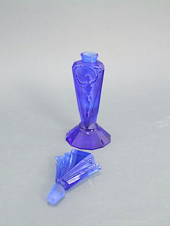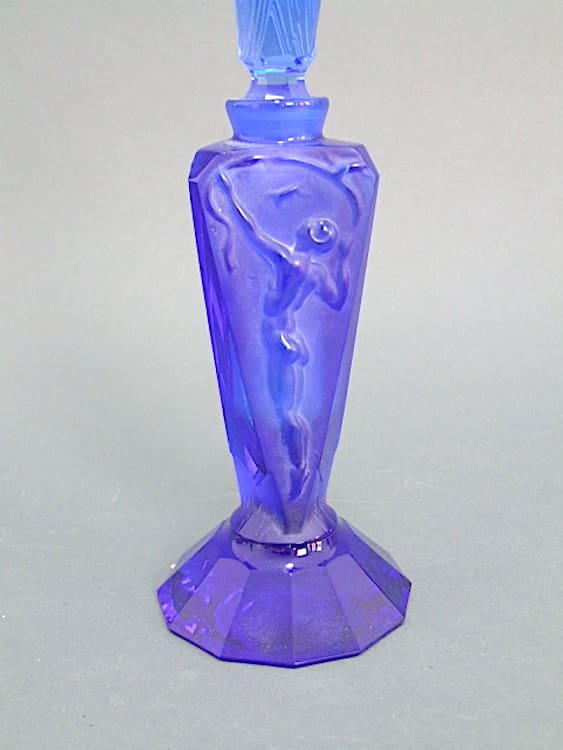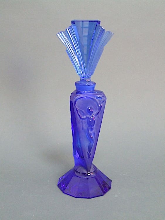 Czech scent bottle by Schlevogt. Triangular in shape with 3 different nudes in different poses. Made of cobalt blue glass.
