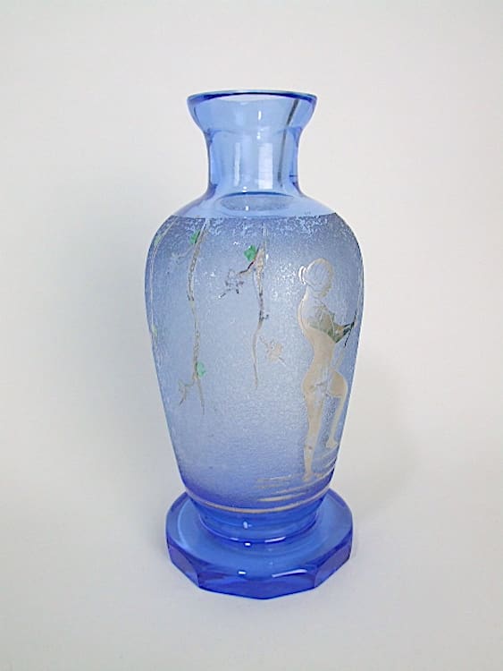 French art deco blue glass bud vase with 2 different silvered nudes to the front and back.
