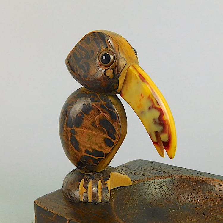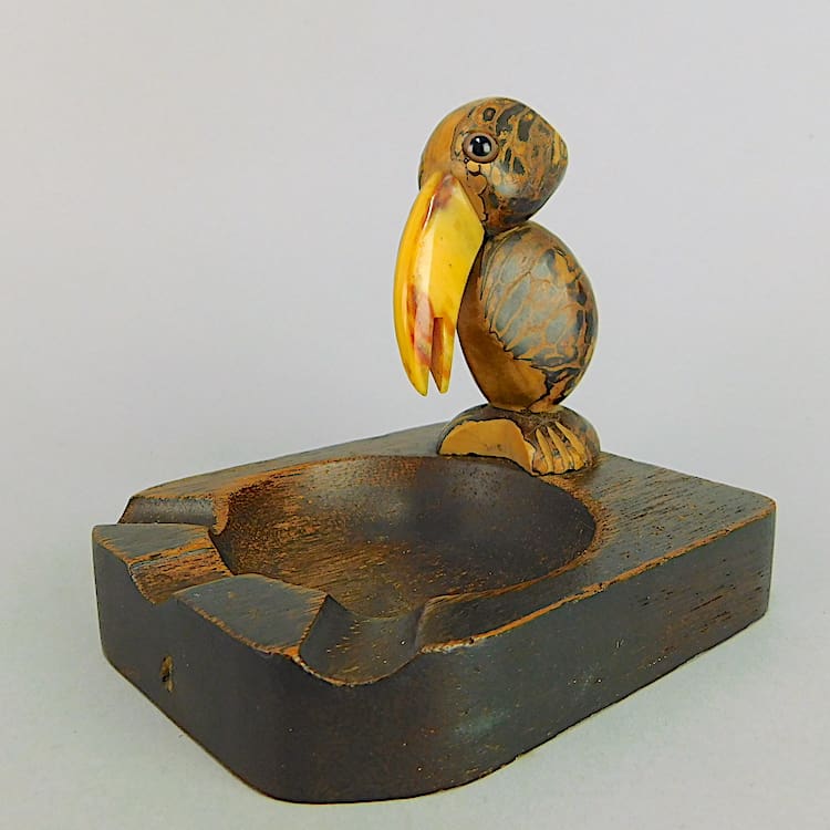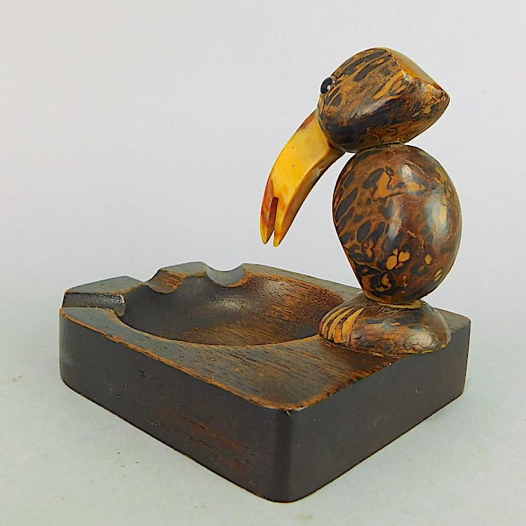 The bird has a body and head made of nuts, the beak and eyes are phenolic and the ashtray base is made of carved wood.