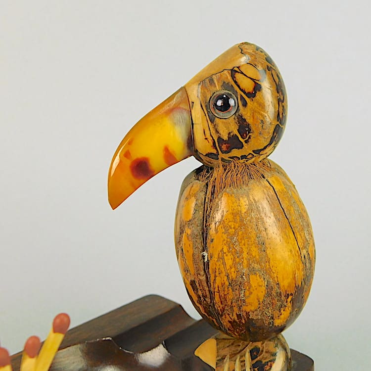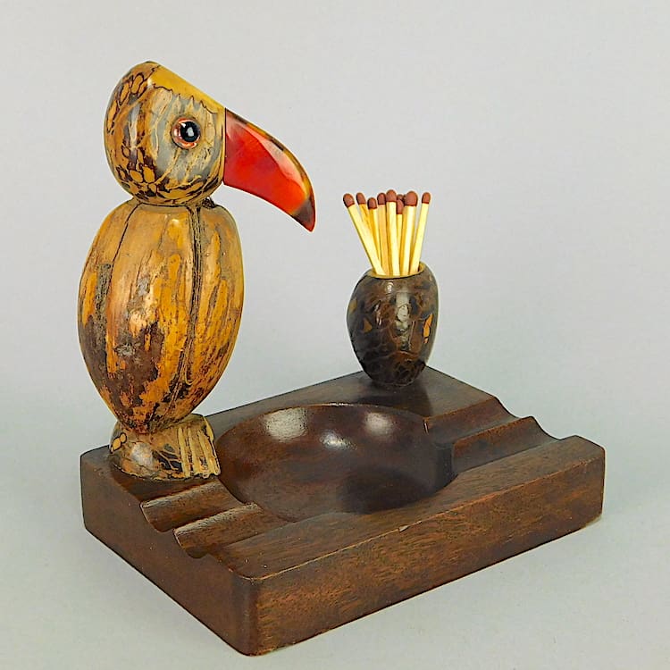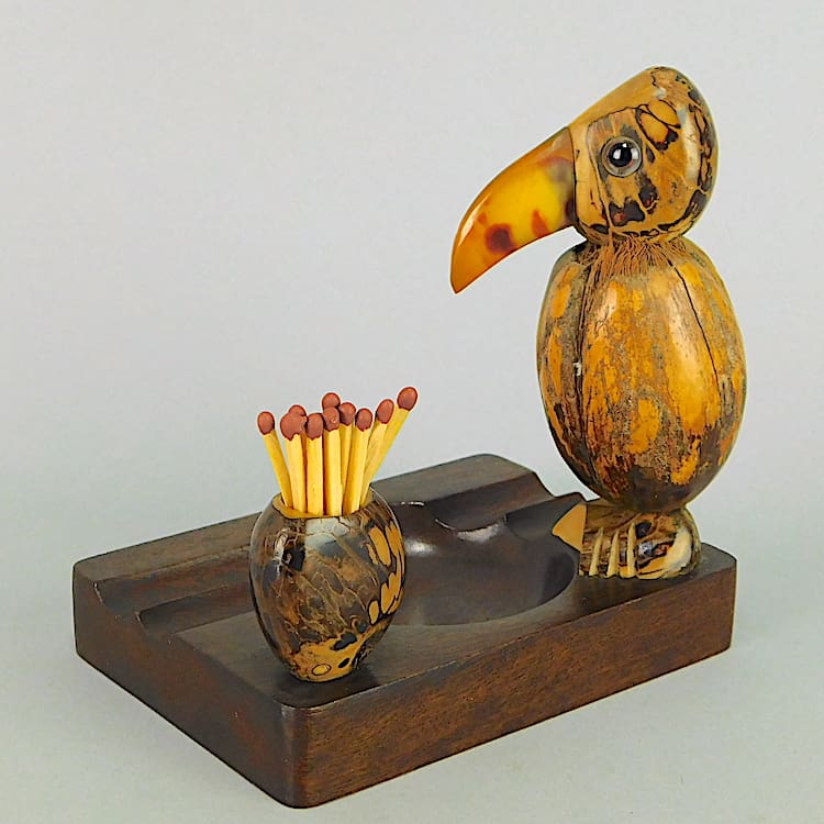 Another of my Dunhill YZ style nutty nut bird items. This one is either an ashtray or a desk tidy – bird with a nut body, glass eyes and red galalith beak.