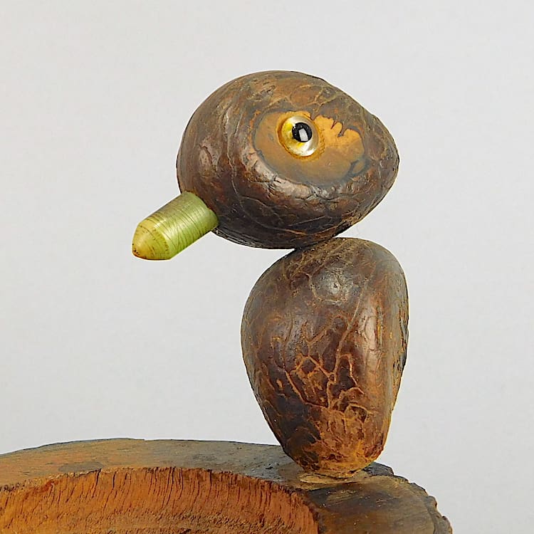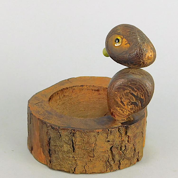 Nut Bird mounted on a dish formed from a branch. Phenolic beak and eyes.
