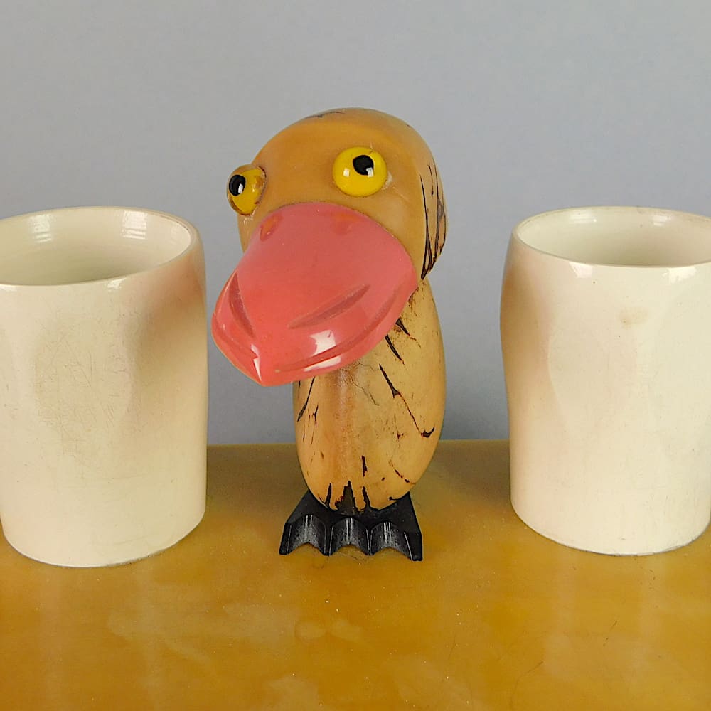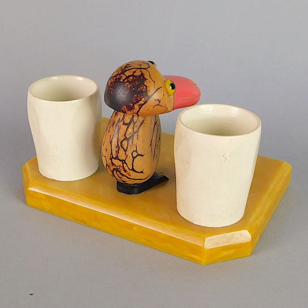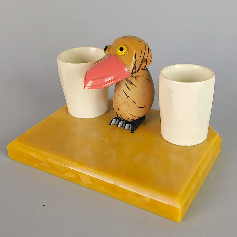 Phenolic art deco pen holder with nut bird and 2 pen cups.