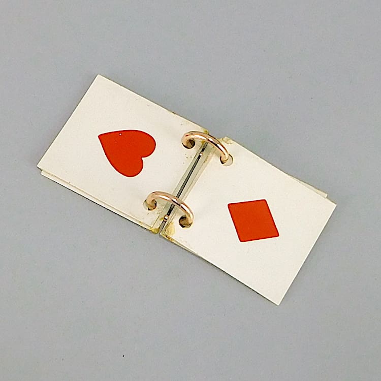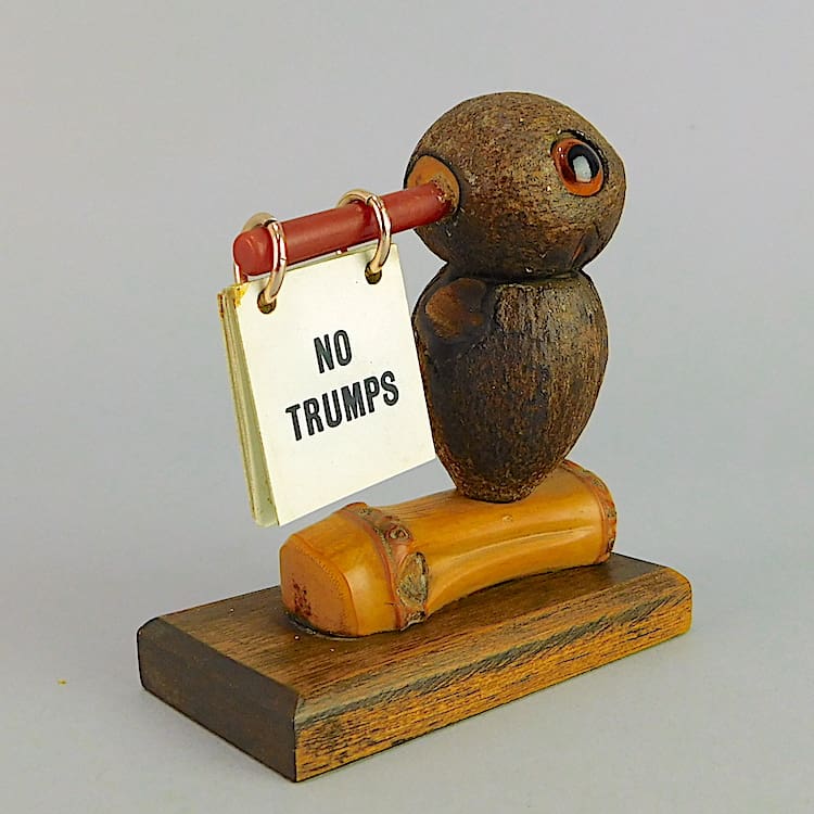 Dunhill style nut bird with celluloid beak and eyes holding a trump marker.