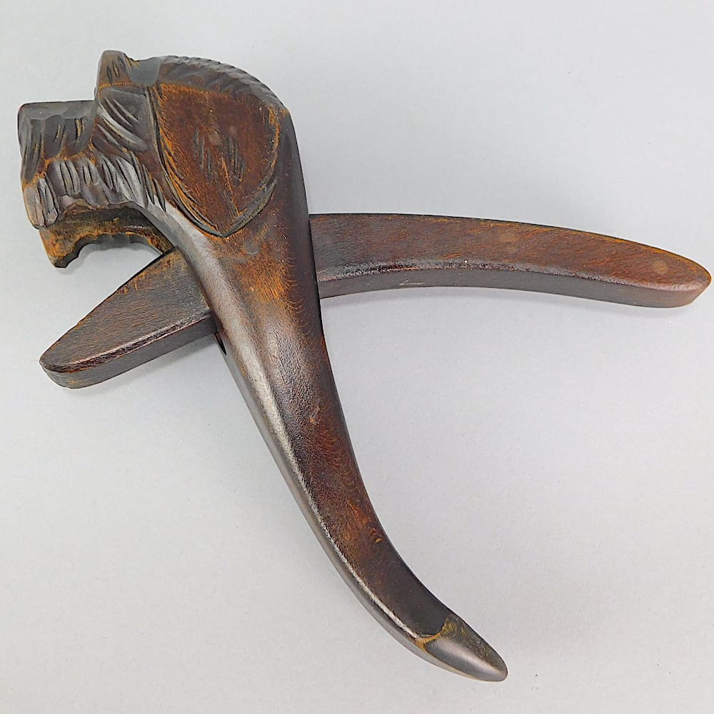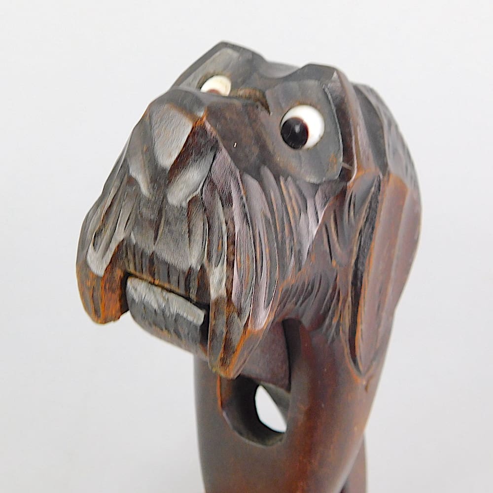 A set of nut crackers. Carved wooden dog with glass eyes.
