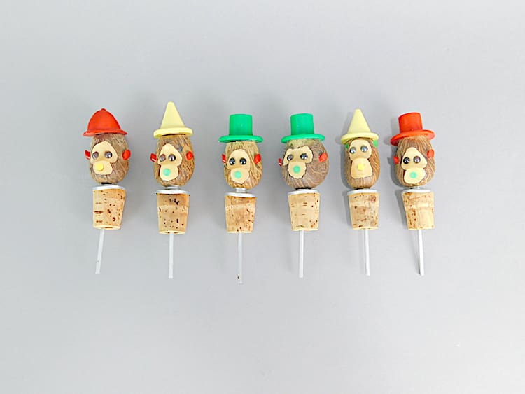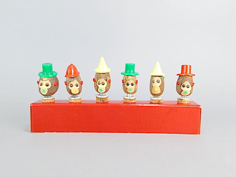 English art deco nut monkey bottle top pourers. Pull the monkeys head off to reveal the pouring spout. Held in by corks into the bottle neck.
